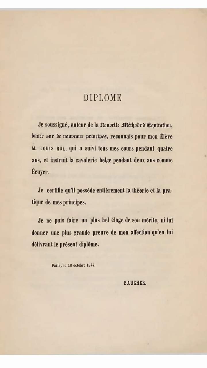🌹 Le seul diplôme que François Baucher ait décerné ! À son élève Louis Rul :